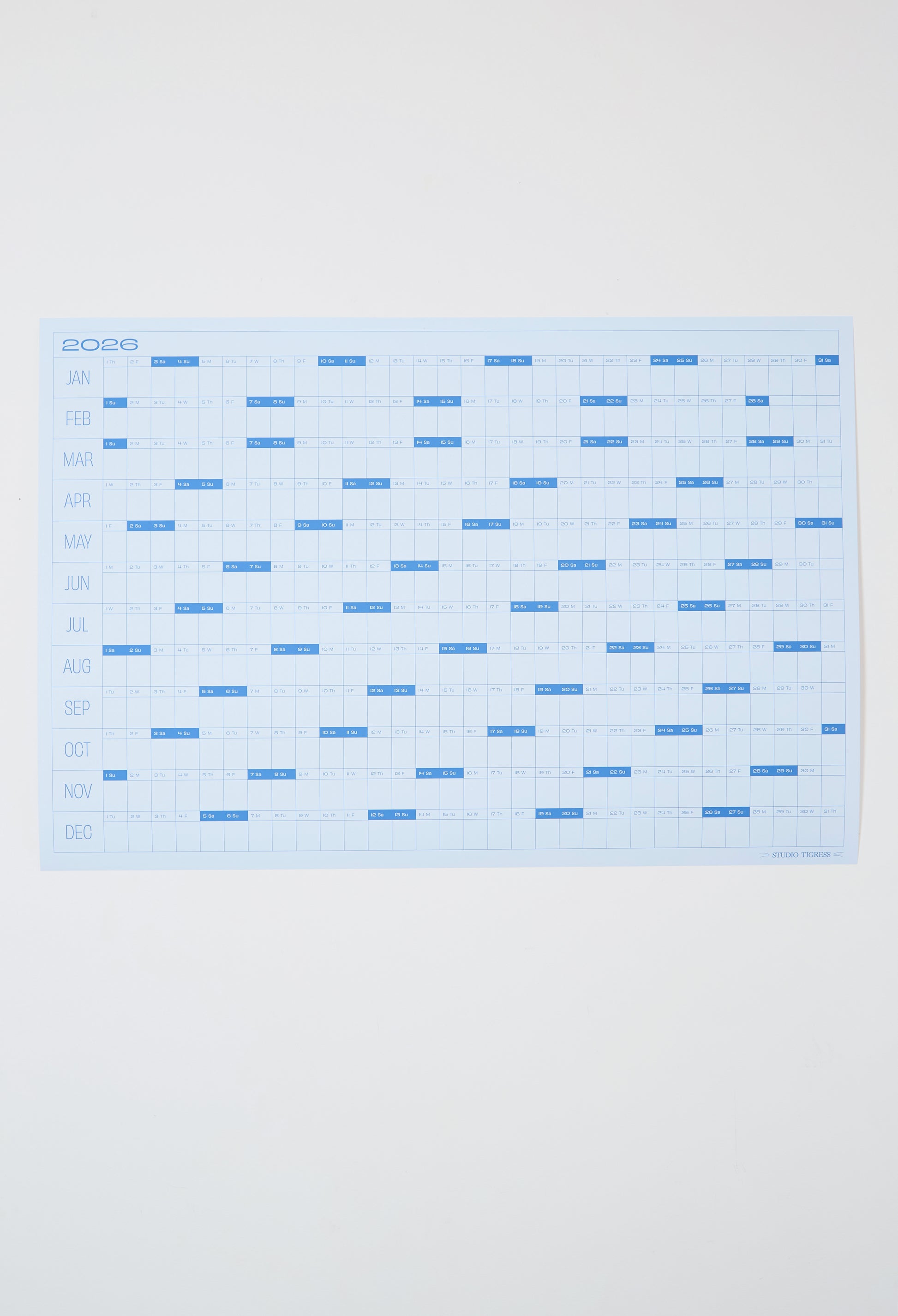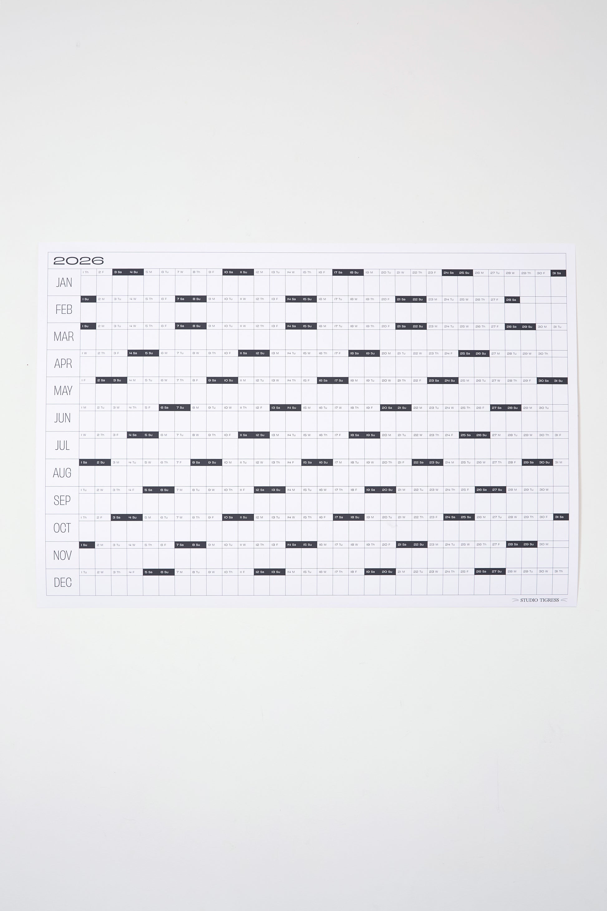 Art and function. Mark it up or leave it blank. Each calendar contains the full year on one design-forward page. Locally printed as a fine art giclee on premium weight, uncoated paper - ensuring superior color depth, sustainability and usability.