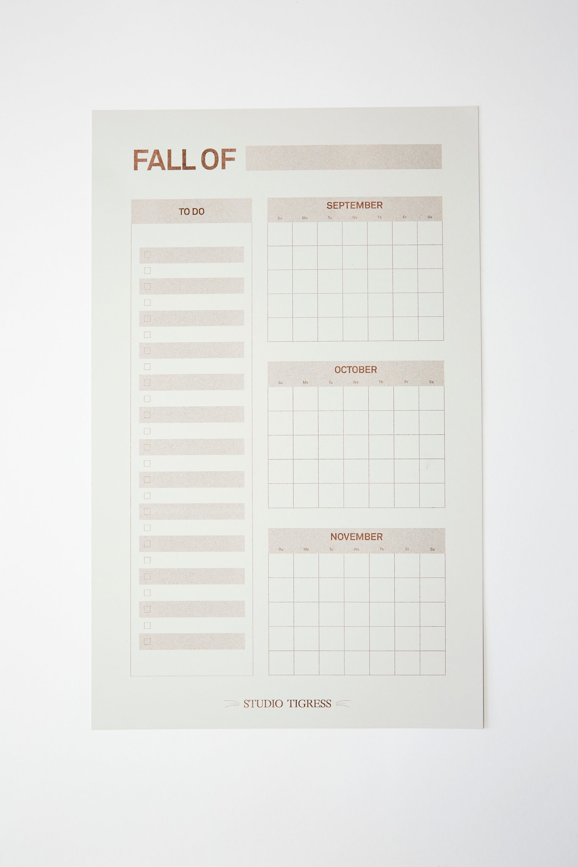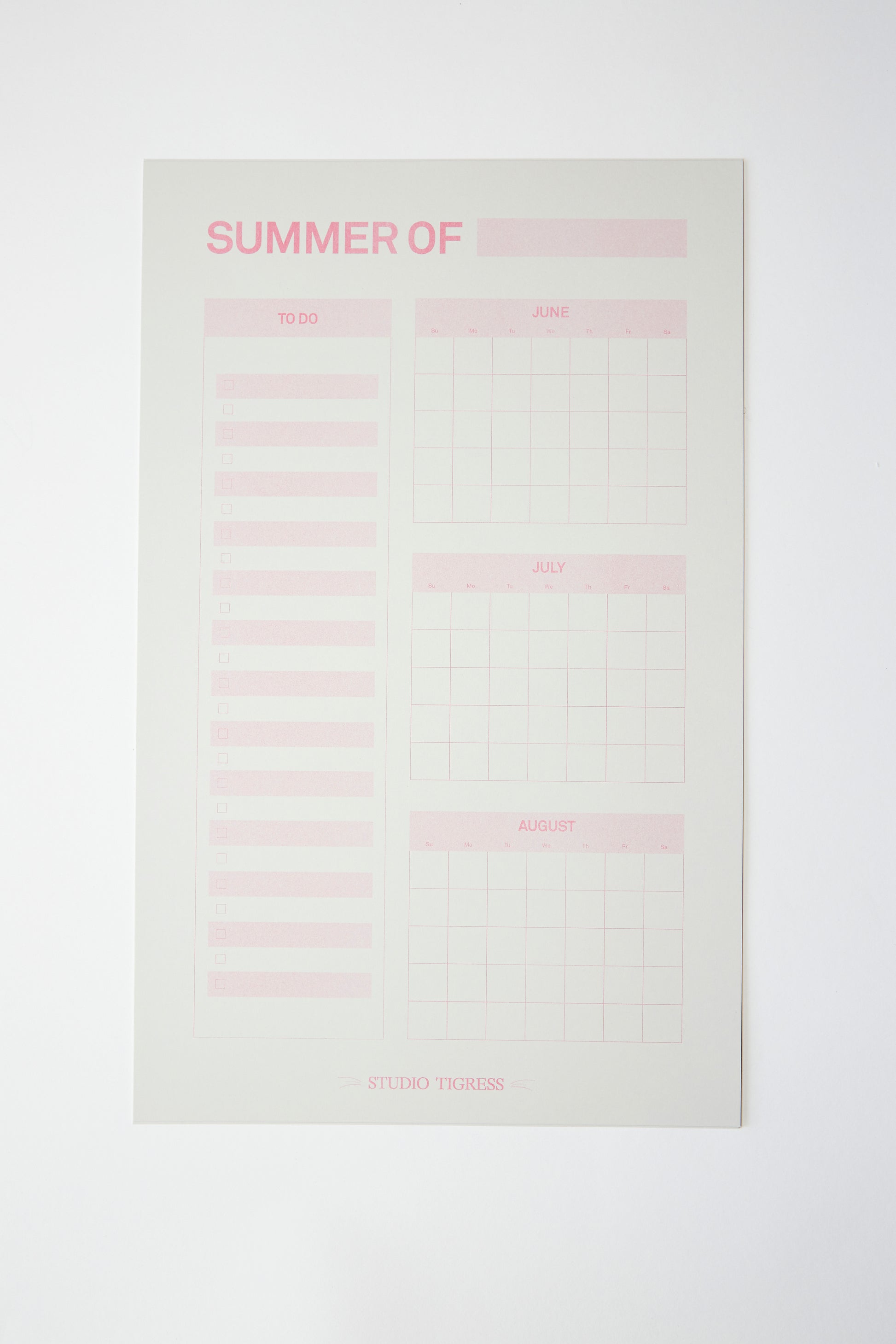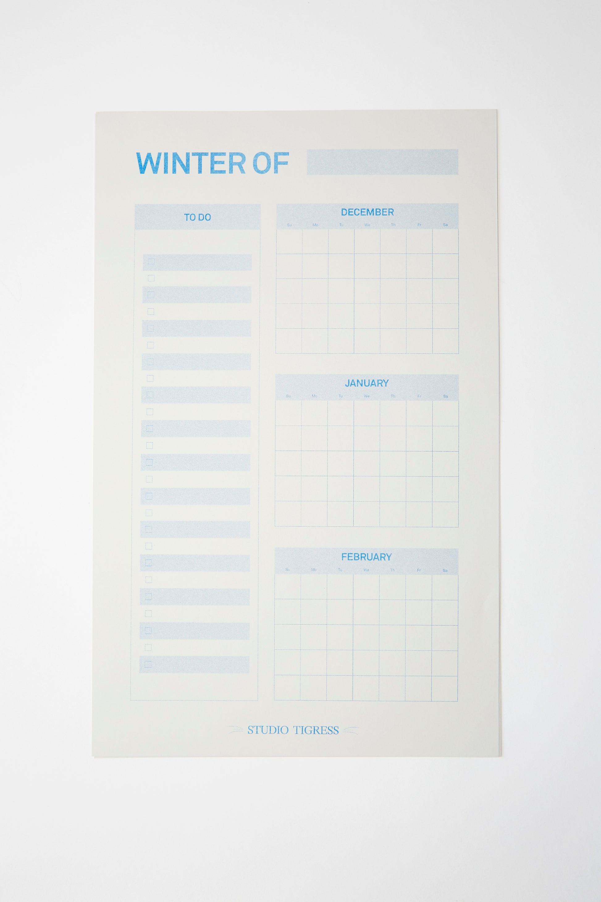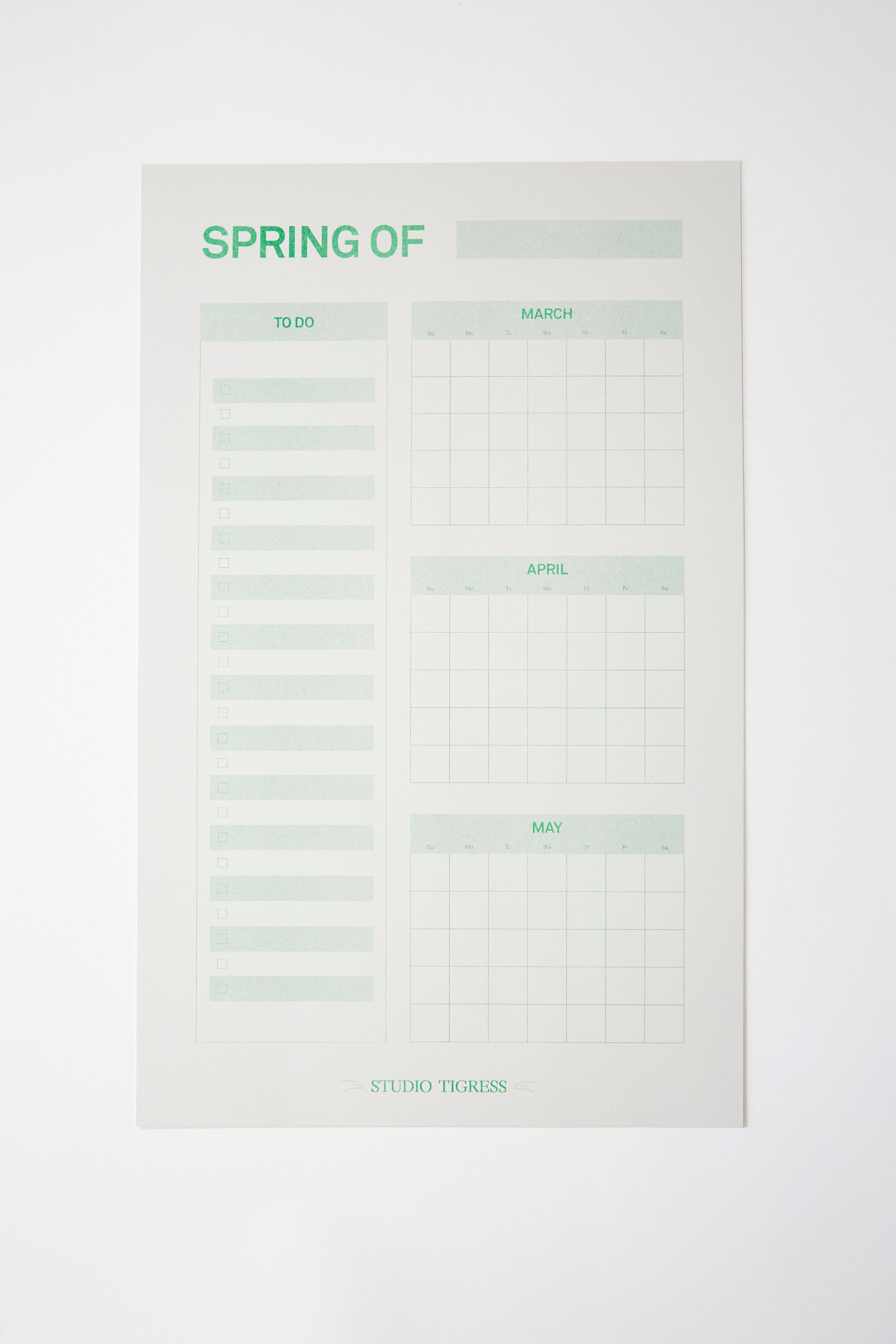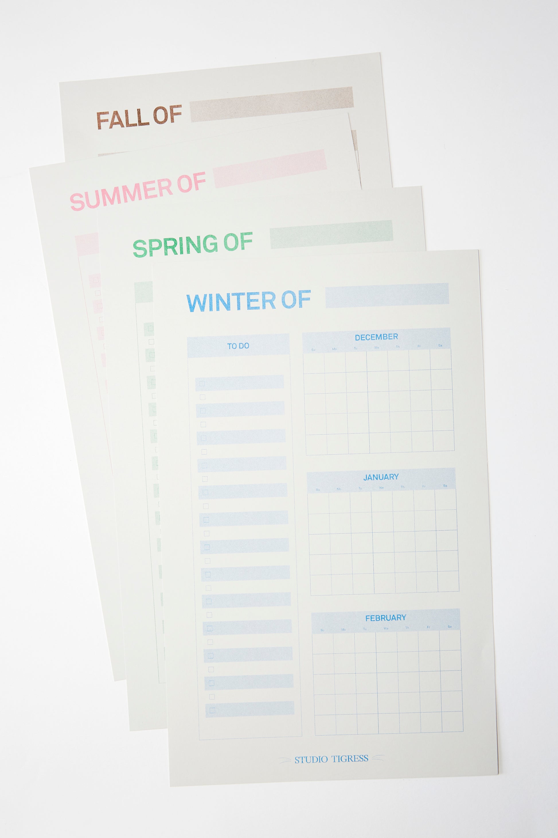 The Seasonal Planners (10" x 16"), are a Studio Tigress exclusive product. Each was printed using traditional Risograph techniques by Secret Room in Portland, Oregon. Each Planner is printed with love on smooth, medium-weight gray cardstock that is made in the USA and sourced from renewable and sustainable tree farms.